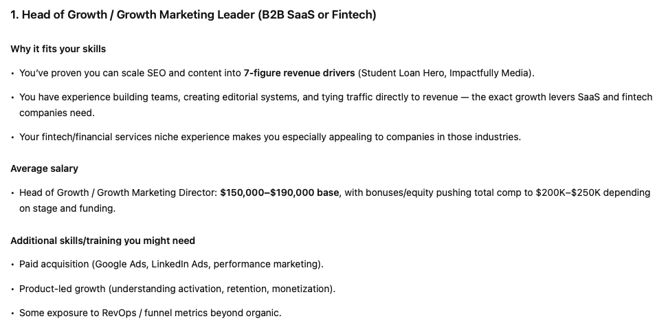 It gave me surprisingly smart suggestions, including industries I hadnโt considered, salary expectations, and why my current skills might translate well.