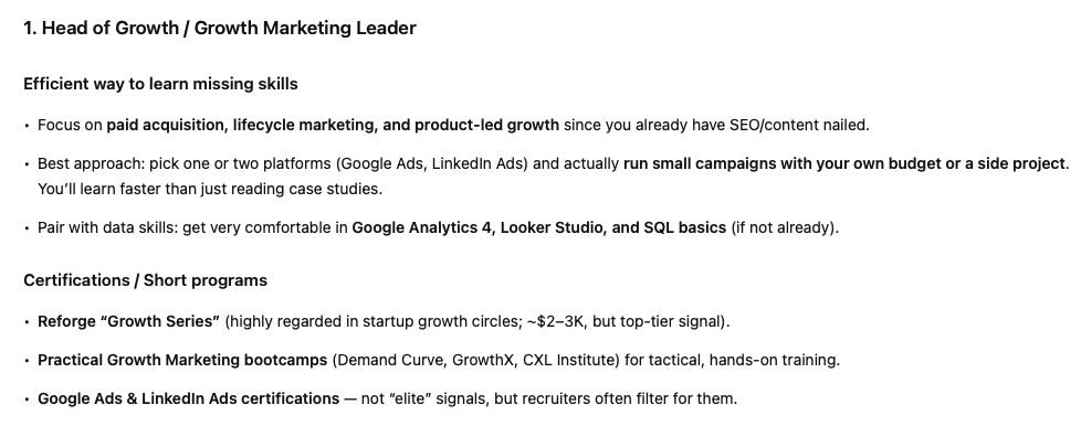 That helped me outline a learning path without wasting time or money. ChatGPT suggested specific skills, tools to learn, and even recommended short courses and projects I could start right away.